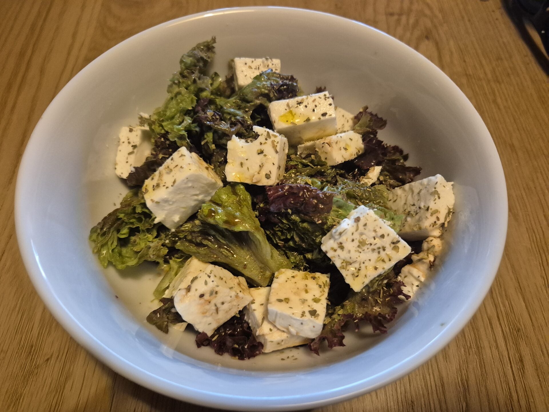 La prânz, am avut intenții bune și execuție aproape reușită. Salată creață amăruie, ulei de măsline, oțet balsamic, ierburi mediteraneene și o cantitate cam generoasă de feta.